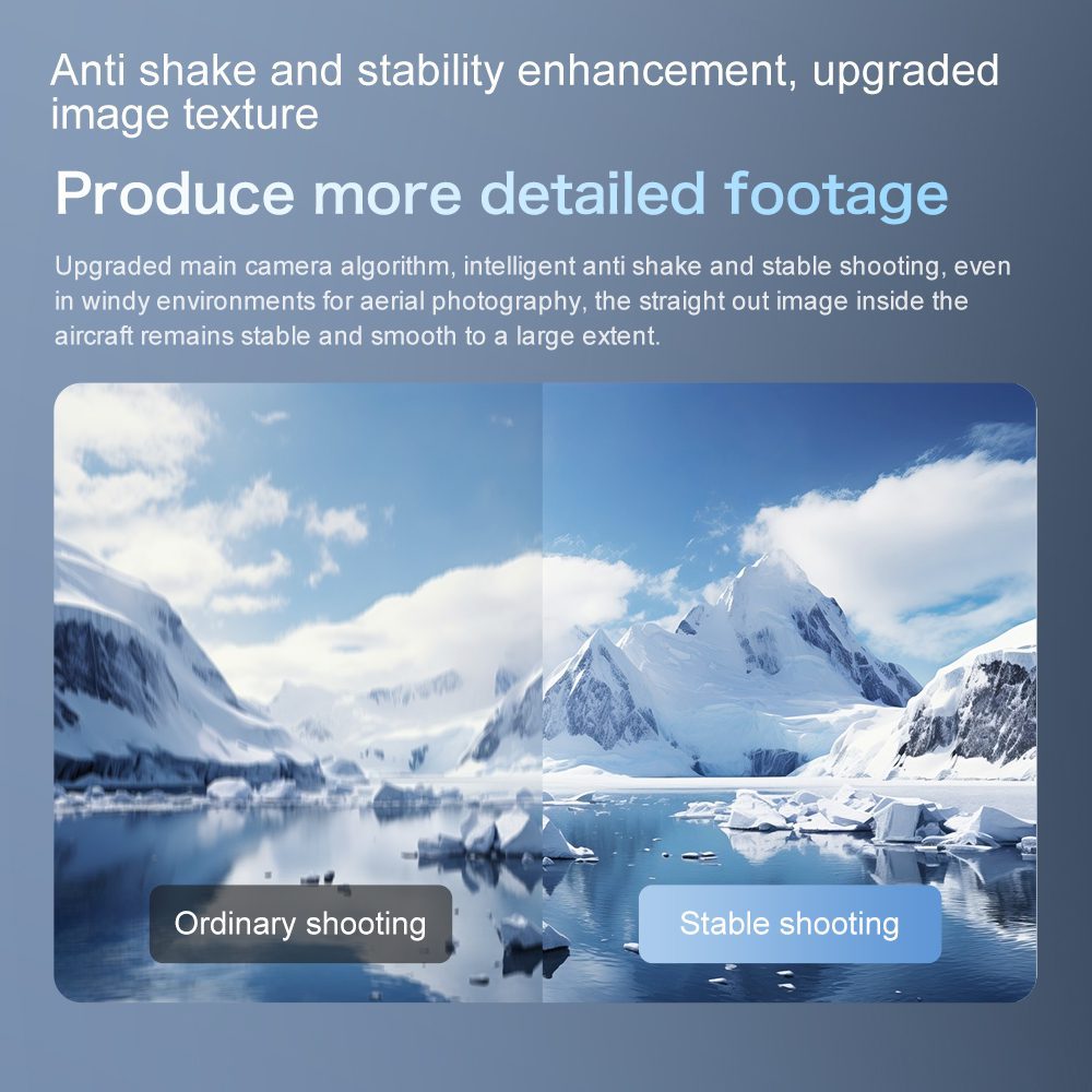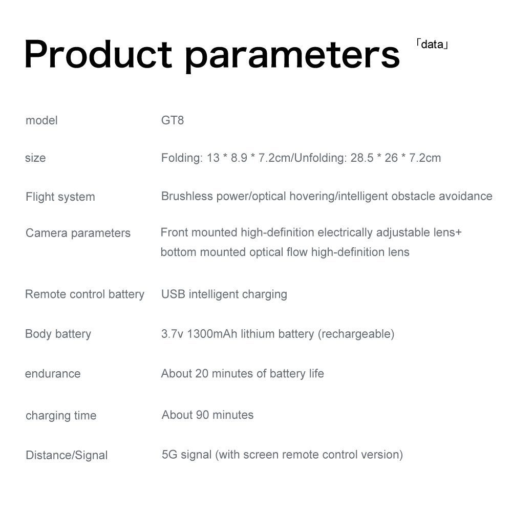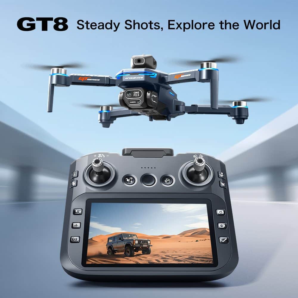 El dron GT8 cuenta con una pantalla remota de 4,3 pulgadas que mejora la experiencia del usuario gracias a su avanzado diseño de lente, que incorpora una mayor estabilidad y EIS (estabilización electrónica de imagen) para obtener fotografías más nítidas. Este modelo está equipado con un modo de mantenimiento de altura y posicionamiento por flujo óptico, lo que garantiza un rendimiento de vuelo estable. Además, el dron incluye una práctica pantalla LCD de potencia en su cuerpo y permite a los usuarios personalizar las rutas de vuelo dibujando las trayectorias deseadas directamente en la aplicación que lo acompaña.