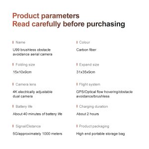 El U99 está fabricado con fibra de carbono ligera para mejorar su durabilidad y rendimiento de vuelo. Cuenta con una pantalla remota HD de 4,5 pulgadas que muestra imágenes en directo estables y de baja latencia a través de una transmisión 5G en tiempo real. El dron utiliza un sistema integrado de posicionamiento GPS y flujo óptico de modo dual para un vuelo estable y un vuelo estacionario preciso. Equipado con una cámara 4K de alta definición, captura imágenes aéreas nítidas. Su sistema de seguridad inteligente incluye evitación de obstáculos por láser de 360° y funciones fiables de retorno automático, que se activan cuando la batería está baja, se pierde la señal o se superan los límites de distancia. Las funciones profesionales, como los modos de seguimiento y punto de interés, garantizan un funcionamiento versátil y seguro.