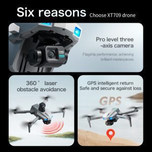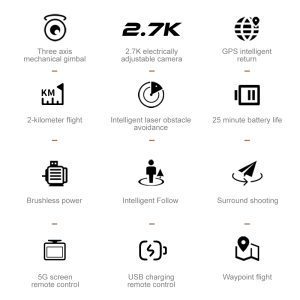 Dron GPS profesional, distancia de vuelo de 3 kilómetros,Estabilización electrónica EIS con cardán de tres ejes, puntería GPS, pantalla de control remoto HD de 4,5 pulgadas, transmisión de imágenes en tiempo real 5G, seguimiento GPS envolvente, posicionamiento GPS, posicionamiento por flujo óptico, modo dual GPS + flujo óptico, retorno con un solo clic GPS, retorno inteligente GPS (retorno por distancia, retorno por batería baja, retorno por fuga), evitación inteligente de obstáculos por láser, cámara 4K de alta definición, seguimiento inteligente GPS, vuelo envolvente.